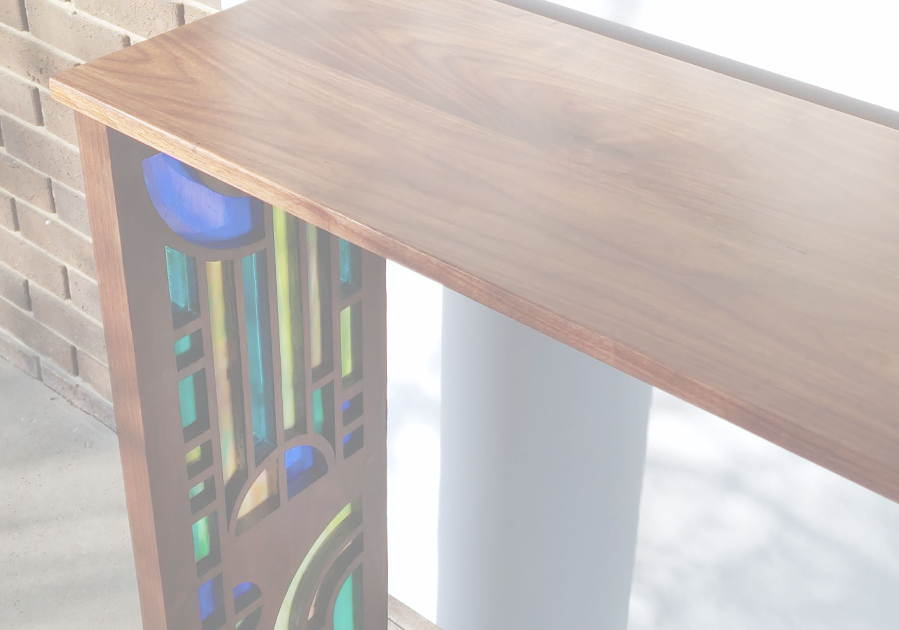 I chose walnut for the structure, but the glass palette was more challenging. Glass shifts with lighting conditions, so I compared with several palettes. The final selection of blues and greens looks beautiful in any setting.